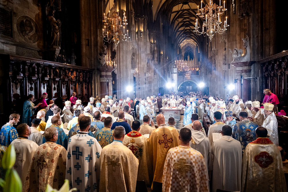 Gottesdienst im byzantinischen Ritus war Mittwochabend liturgischer Höhepunkt der Wiener Vollversammlung der Bischöfe der katholischen Ostkirchen Europas - Kardinal Schönborn in Predigt: "In der Liturgie sind wir ganz besonders mit dem Himmel verbunden", gerade in Zeiten des Krieges und der Not. Wir waren mit der Kamera dabei.