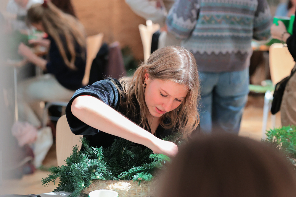 Gefüllt mit Tannenduft und über 160 Studierenden hat in sämtlichen Räumlichkeiten der Katholischen Hochschulgemeinde das beliebte KHG-Adventkranzbinden stattgefunden. Ob kirchenfern oder glaubensbegeistert: bunt durchmischt konnte man plaudern und sich bei Glühwein, Mandarinen und adventlicher Musik auf diese besondere Zeit der Erwartung einstimmen.